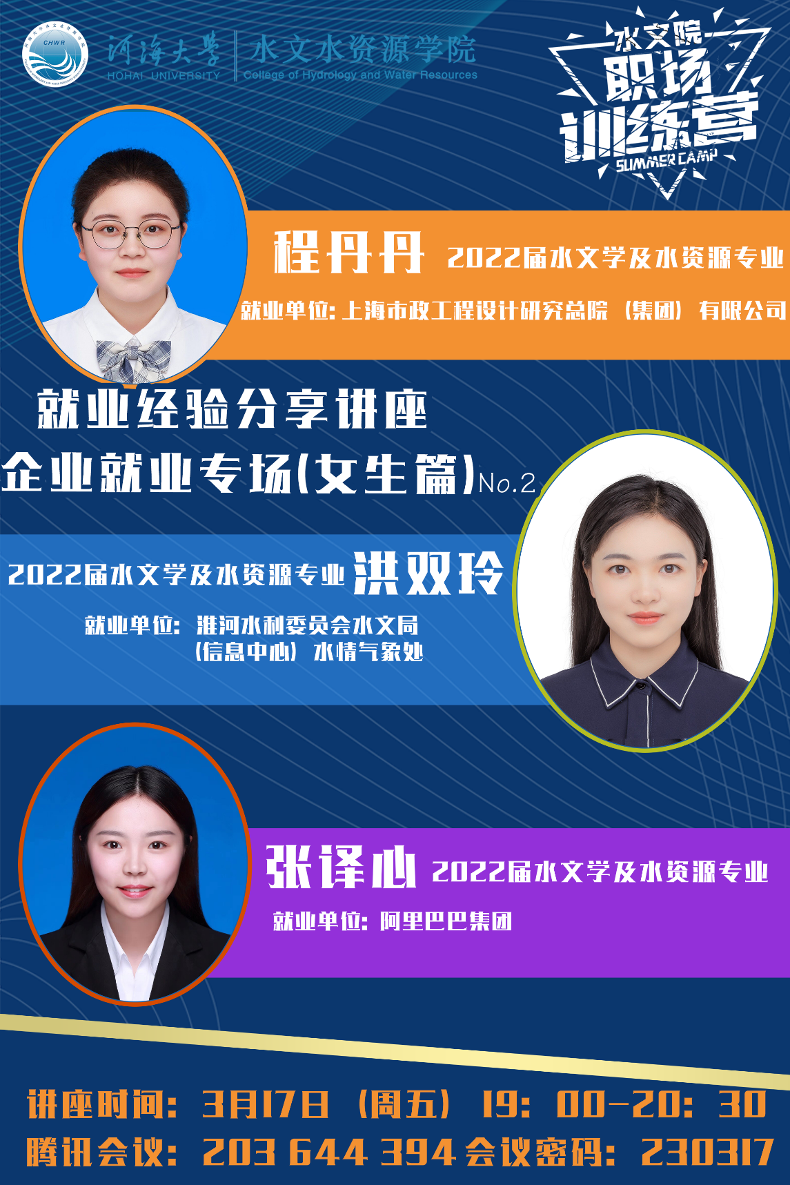 阳春三月,又是新一轮春招来到。为精准高效做好指导服务,扎实开展就业帮扶,提高女生就业成功率,3月17日,妖精视频 开展了第四期职场训练营活动,邀请2022届水文学及水资源专业程丹丹、洪双玲及张译心三位优秀女毕业生分享企业校招就业经验。本次活动由研究生辅导员林彦老师主持。