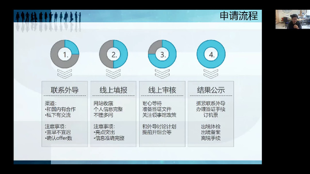 王孟浩学长介绍了国家留学网和国家公派留学管理信息平台两大网站,并为大家详细讲解了申请公派留学的四个步骤:联系外导、线上填报、线上审核及结果公示。此外,王孟浩学长通过两个施一公先生的小故事向大家分享了在科研方面的心得与感悟,他提醒大家在学习和科研过程中要注重“聚焦”,才能利用好时间,提高学习和科研效率。