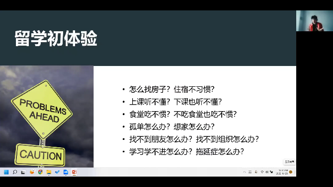李泰霖学长向同学们分享了留学前所要做的准备工作,讲述了在留学期间容易遇到的难题,并逐一分享了他的解决方法。例如,在面对语言沟通困难时,可以通过多参加语言交流活动以及寻找语言交流伙伴等方式提高外语表达能力。在专业学习方面,李泰霖学长提醒大家要多参加小组作业和实习活动,对于专业问题要敢于提问和质疑,才能在交流中不断充实和丰富自己。