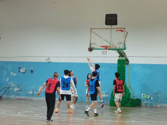 随着一声哨响,比赛拉开帷幕。双方队员充分发挥自身优势,你争我抢、奋力拼搏。红队经验丰富,战术严密,凭借默契的配合,精准的投球,先拔头筹;蓝队稳住阵脚,步步为营,扳回一城。两队间势均力敌,比分你追我赶,活动现场气氛激烈澎湃。经过激烈角逐,红队以66:54的比分获得本次比赛胜利。赛后,双方友好地握手,合影留念,共同铭记此次球赛的喜悦与汗水,相约今后将继续开展此类活动,促进师生间交流。