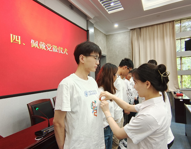 集中宣誓仪式在庄严的国际歌声中拉开序幕,在2019级水文一班硕士研究生党支部书记林源君同志的领誓下,新发展的预备党员面向党旗进行了庄严宣誓。宣誓仪式结束后,正式党员代表为新发展的预备党员们佩戴上了象征党员身份的党徽。