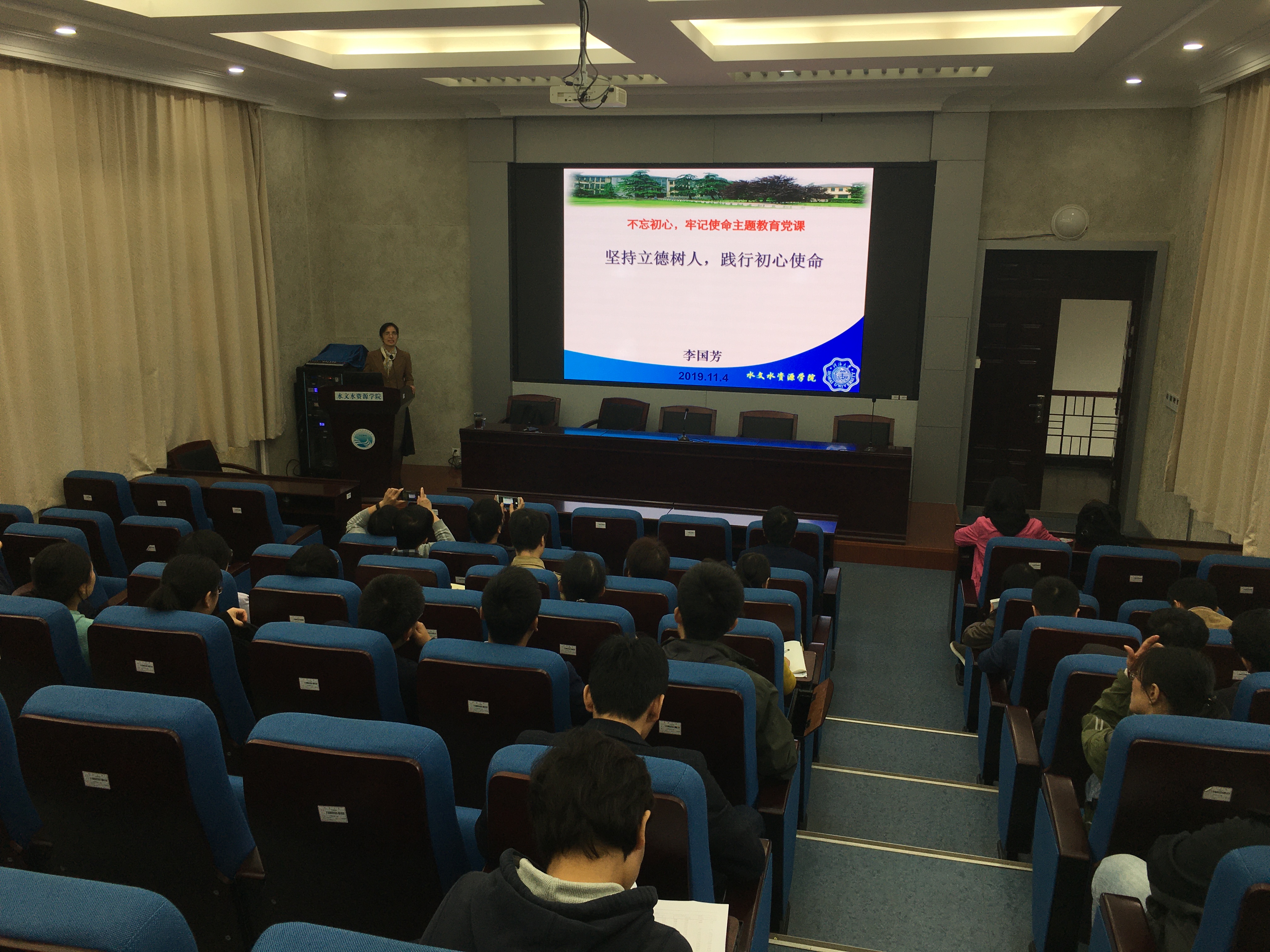 11月1日下午,党委副书记鲁扬以《新时代高校党员的使命与担当》为题,为全体学生支部书记、支部委员、党员代表上党课。党课紧紧围绕“不忘初心、牢记使命”主题,提出并回答了“什么是‘初心’和‘使命’?”“什么是担当和作为?”“为何要强调‘不忘初心、牢记使命’与担当作为?”“新时代高校党员如何担当作为”四个问题。鲁扬副书记指出,新时代开启新征程,新征程呼唤新使命新担当。作为水利高校,我们要紧跟党中央要求,以高度的政治责任感和历史使命感,采取得力措施贯彻落实“节水优先”方针政策。她要求大家,作为新时代高校大学生党员,不忘初心、牢记使命,就要把誓言刻在心中,始终坚定理想信念;不忘初心、牢记使命,就要赓续精神力量,努力学习,从党的光辉历史中汲取源源不断的前进动力;不忘初心、牢记使命,就要永远保持奋斗姿态,不畏艰难勇往直前。