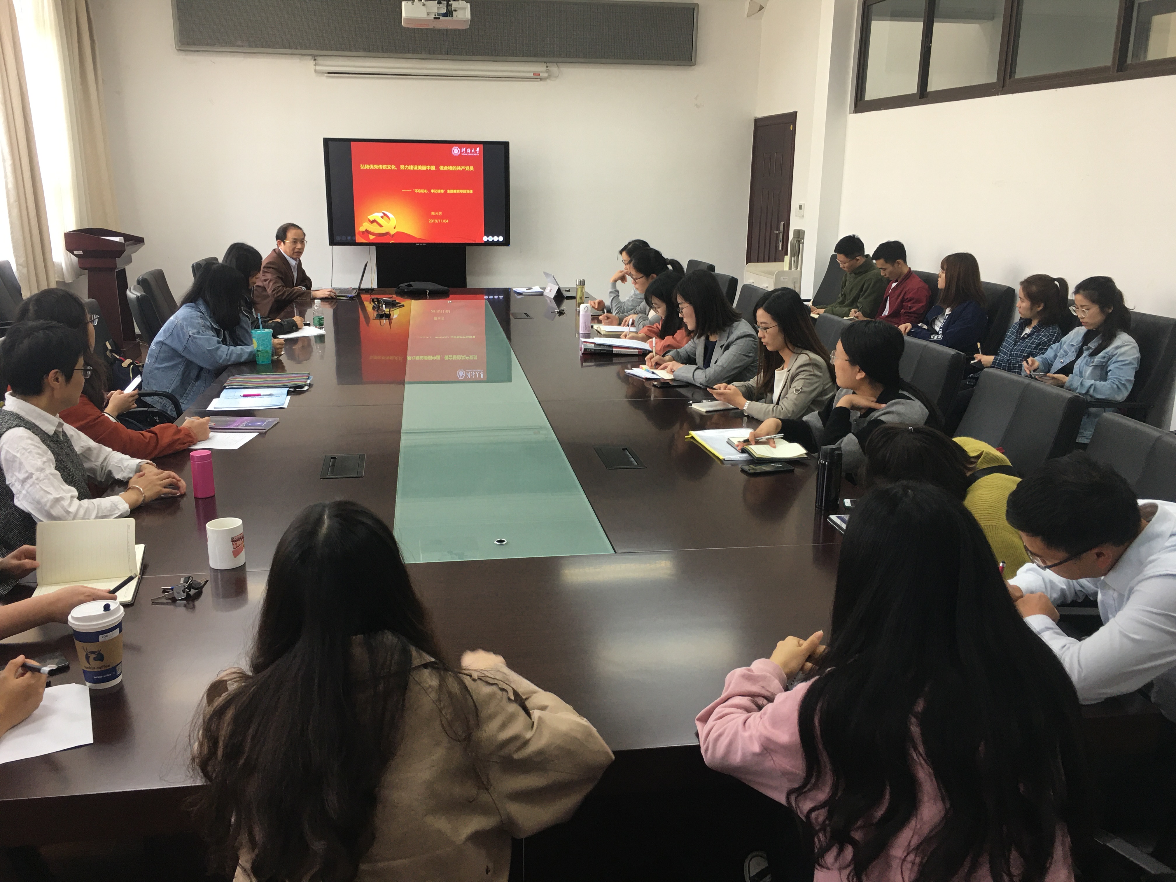 11月4日下午,党委书记陈元芳以《弘扬优秀传统文化,努力建设美丽中国,做合格的共产党员》为题,为两办党支部、全体党支部书记上了一堂生动的党课。党课从习近平总书记“中华优秀传统文化是中华民族的根和魂”等关于文化建设重要论述,“生态兴则文明兴,生态衰则文明衰”等关于美丽中国建设重要论述出发,对我国生态环境保护现状与问题进行分析,进而产生“我们既要绿水青山,也要金山银山。宁要绿水青山,不要金山银山,绿水青山就是金山银山”这一重要发展理念,山水林田湖草系统治理等举措,最严格生态环境保护制度等。陈书记对妖精视频 弘扬传统文化所开展的工作进行了回顾,介绍了刘光文先生百年诞辰、赵人俊90周年诞辰系列活动情况,到刘光文水文科技教育基金的成功运作,刘光文精神的不断凝练,不断地丰富学院文化建设内涵。最后,陈书记提出并回答了针对美丽中国奋斗目标,咱们水文人该做点什么的现实问题,他指出,广大党员师生要进一步认真学习领会习近平新时代中国特色社会主义思想的内涵和意义,充实和完善人才培养方案,体现新时代对知识能力的新要求,加强教师队伍、实验条件建设,提升水生态环境学科方向的核心竞争力。广大党员师生要以黄大年、郑守仁等时代楷模为榜样,不忘初心,牢记使命,集中力量承接国家层面重点重大项目,为解决美丽中国建设中的重点难点问题提供更大的支撑。