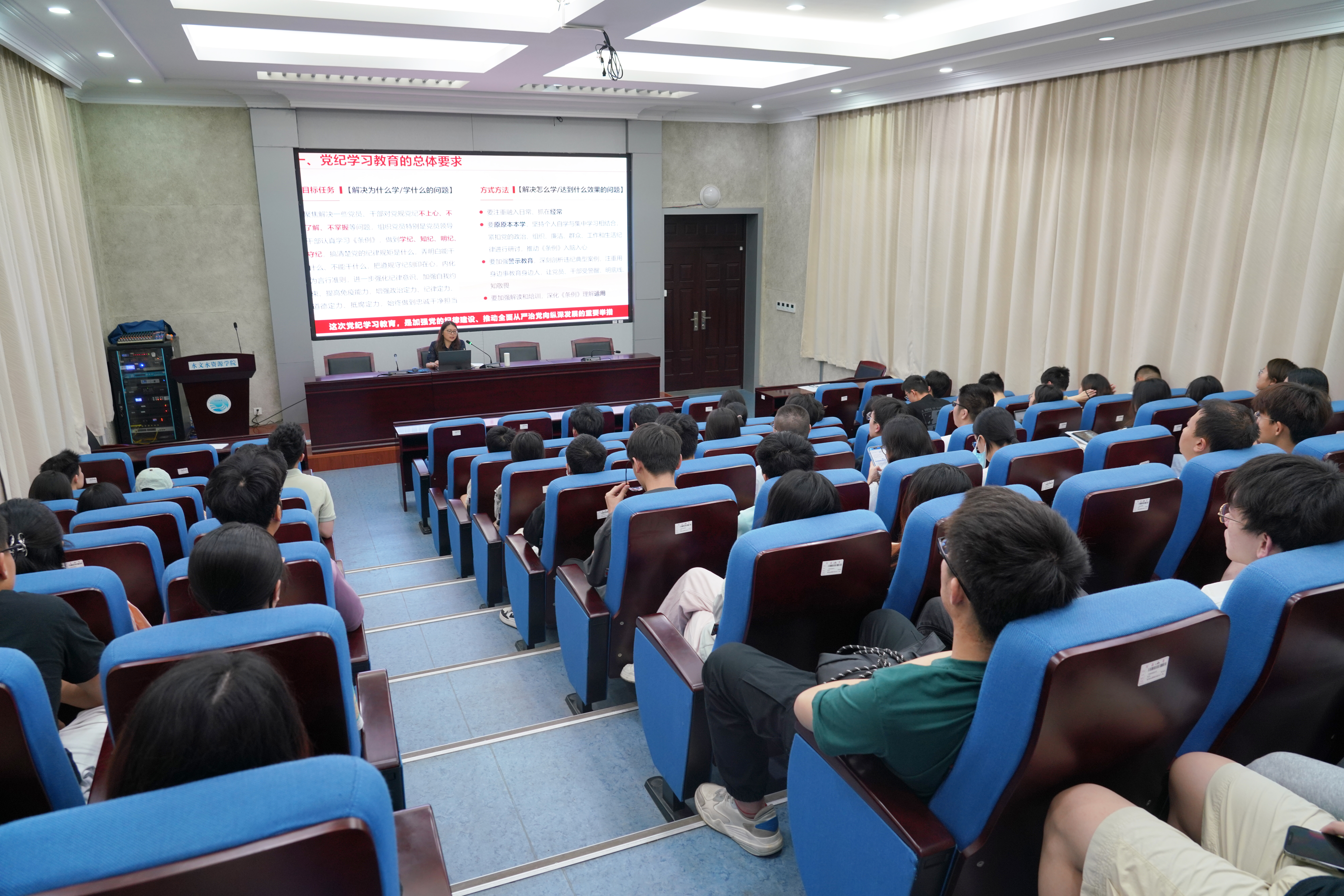 陈书记以感悟水文大师刘光文先生对纪律的遵循为切入点,通过对刘先生心系祖国、刚正不阿、严于律己、淡泊名利的生平介绍,引导同学们思考新时代水文人的责任与担当。陈书记紧扣习近平总书记关于党的纪律建设的重要论述,介绍了党纪处分条例历次修订完善的主要进程,阐释了此次《中国共产党纪律处分条例》修订的重大意义、总体要求,结合典型案例,对《中国共产党纪律处分条例》修订的重点内容进行了详细解读。她强调,全体党员和入党积极分子要学纪、知纪、明纪、守纪,把遵规守纪刻印在心,内化为“日用而不觉”的言行准则,以高度的政治自觉、思想自觉和行动自觉完成好各项工作,遵守党纪,发挥党员带头作用。
