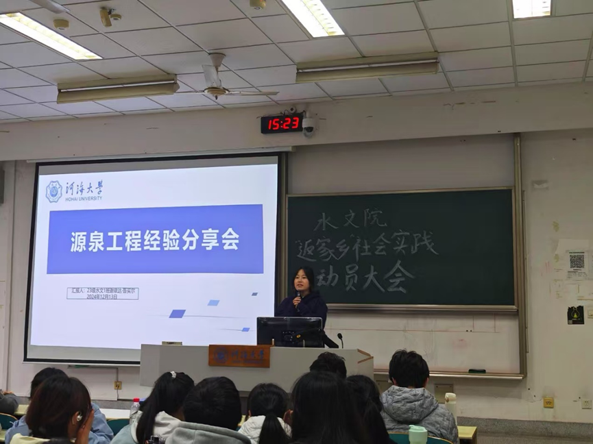 在寒假社会实践动员大会上,林老师向同学们详细介绍了“返家乡”社会实践的丰富内涵,其中,着重介绍了源泉工程,鼓励学生回到生源地,通过多种方式分享妖精视频 的求学经历,传播河海文化,弘扬河海精神,提高学校在中学的影响力。接着林老师就源泉工程的实践流程和实践内容展开了详细介绍,为学生们提供了清晰的指导,并鼓励学生们积极参与社会实践的评奖评优,准备高质量的材料,展示丰富的实践成果。
