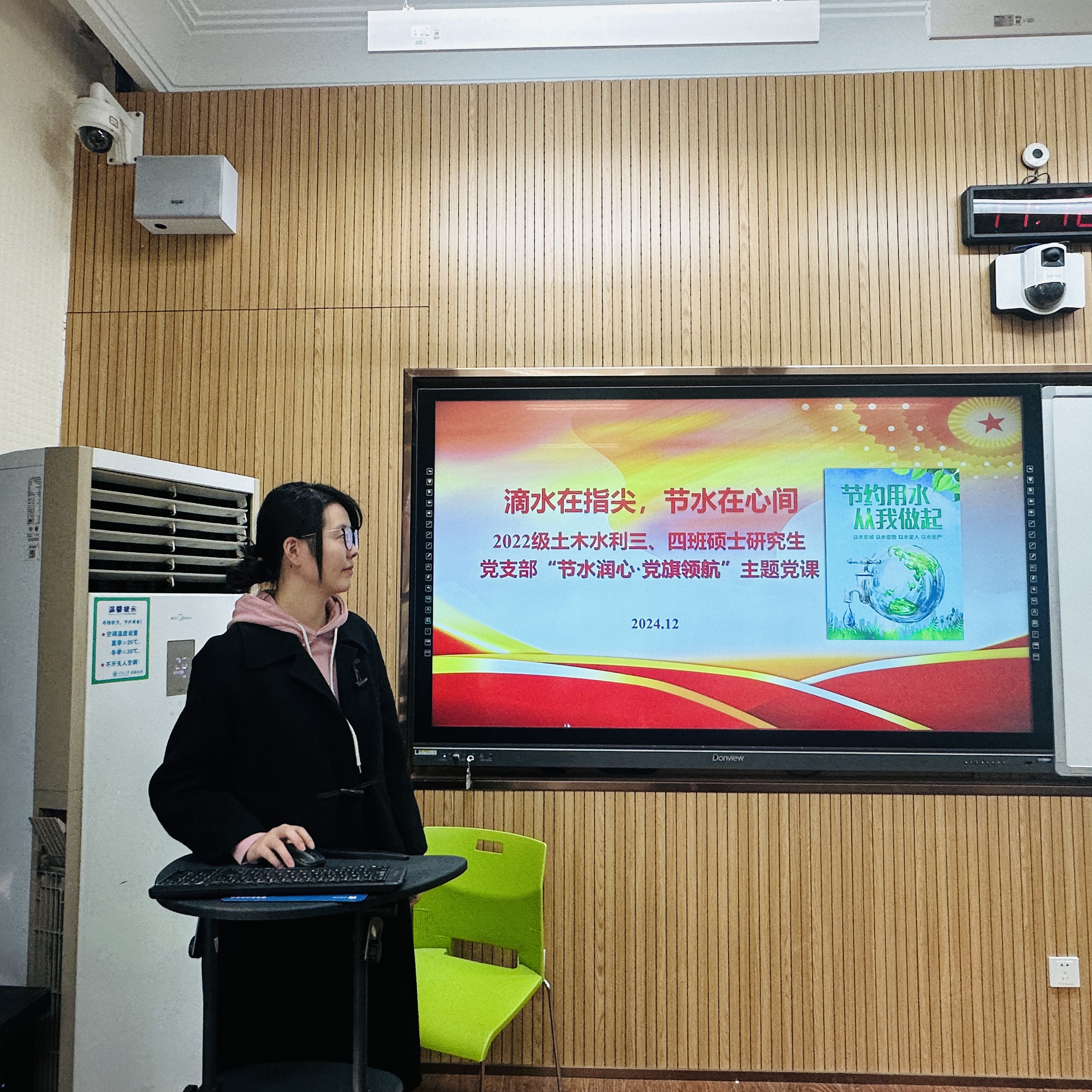 支部纪检委员张珂以“滴水在指尖,节水在心间”为题,从总体思路、加强用水管理、完善节水措施、强化保障监督、严格法律责任五个方面带领支部党员学习《节约用水条例》。在此基础上,支部党员在节水承诺书上签名,承诺将节水行动融入日常生活,做到“从我做起,从现在做起,从点滴做起”。