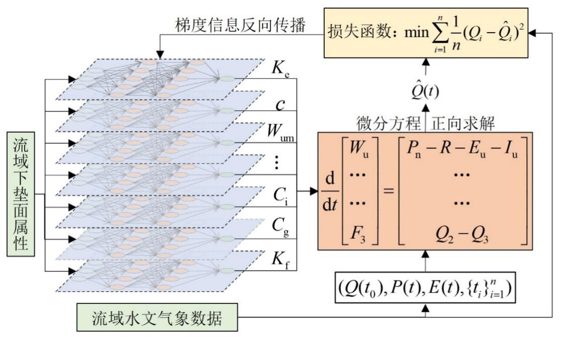 如何利用微分形式水文模型过程连续、时间尺度灵活的特点,进行模型参数优化是AI与水文模型耦合研究的热点内容之一。研究团队基于神经常微分方程理论,使用神经网络表征流域下垫面属性与水文模型参数的映射关系,提出一种物理机制和深度学习耦合的参数优化方法。该方法将神经网络嵌入水文模型的微分动力系统,使用常微分方程数值求解器正向模拟连续水文过程,计算损失函数并反向传播梯度信息以更新神经网络参数,从而实现水文模型参数的优化。研究表明,基于该方法确定的新安江模型参数,与理想参数“真值”的误差平均不超过9.8%,该方法可有效搜索水文模型参数空间,提供更优的参数估计与洪水预报精度。
