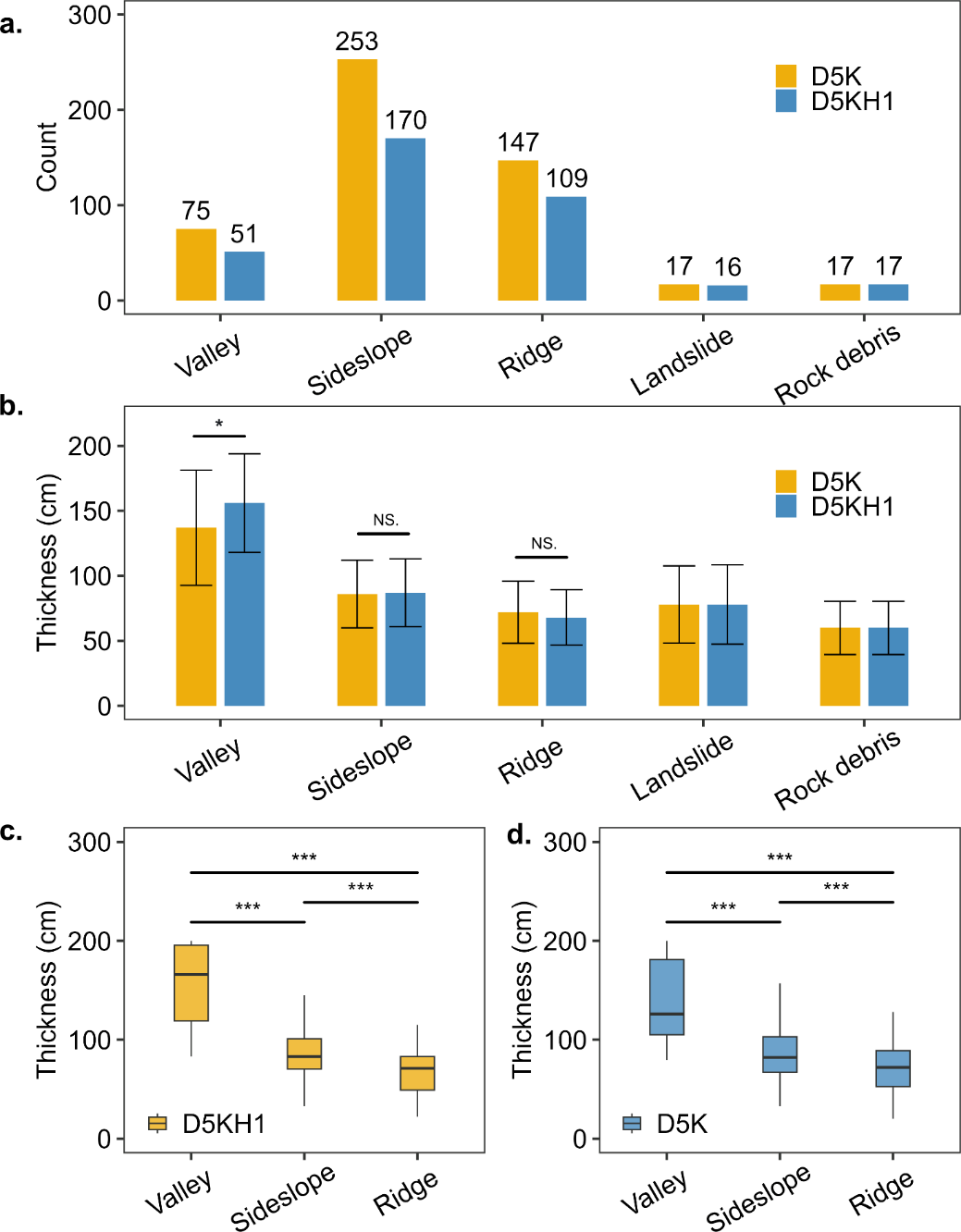 图3. 不同位置土壤厚度采样点数目及厚度分布