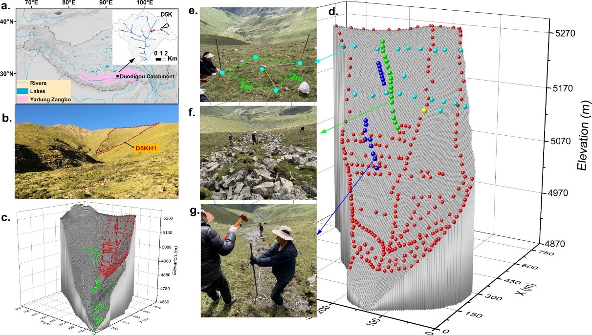 青藏高原素有“地球第三极”之称,其高山草甸土壤在高寒环境下既脆弱又至关重要,不仅影响区域降雨-径流响应,还直接关系到生态系统的稳定性。然而,由于地势险峻、气候苛刻,野外采样困难重重,导致土壤厚度空间分布规律长期以来研究不足。本研究以拉萨市北郊夺底沟子流域为研究区域,针对海拔约5000米的高山草甸土壤开展了系统调查(见图1)。研究团队采集了大量土壤样品,测定了土壤厚度、质地、饱和导水率、有机质含量及矿物组成等关键参数。研究表明,冻融循环和有机质累积是塑造青藏高原高山草甸土壤的主导因素。冻融过程通过抑制有机质分解促进其累积,同时引发岩石崩解和高海拔砾石带的形成;而较低海拔的滑坡则为土壤厚度分布引入更多变数(见图2)。这些机制共同作用,深刻影响了土壤的空间格局,展现了高寒环境下的独特土壤发育规律。