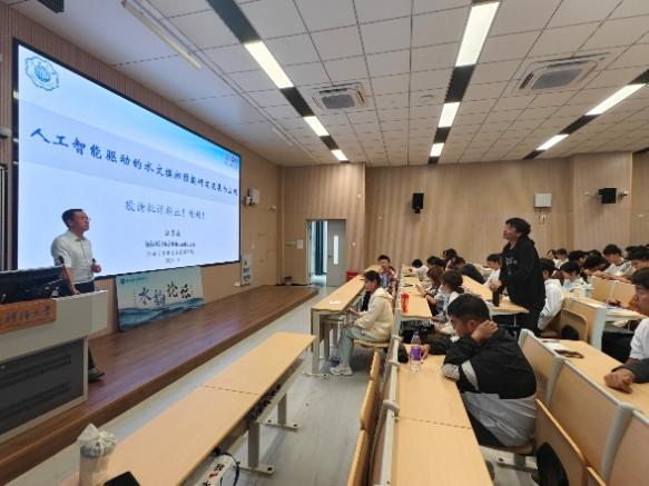 江善虎教授首先带领同学们系统回顾了人工智能技术的起源与发展历程,指出人工智能正推动各领域的范式重构与能级跃升,水利学科与人工智能的深度融合,将为破解复杂水问题提供全新视角。江善虎教授还从水文研究的基本范式出发,围绕人工智能在水文领域的实际应用,为同学们引出“混合水文模型”这一新兴研究方向,分别介绍了其在洪水预报、气象预测等方面的广泛应用,并勉励在场同学树立远大理想,明确学习目标,不断提升专业能力,将“水利+AI”的智慧实践书写在祖国江河湖海的宏伟蓝图中。