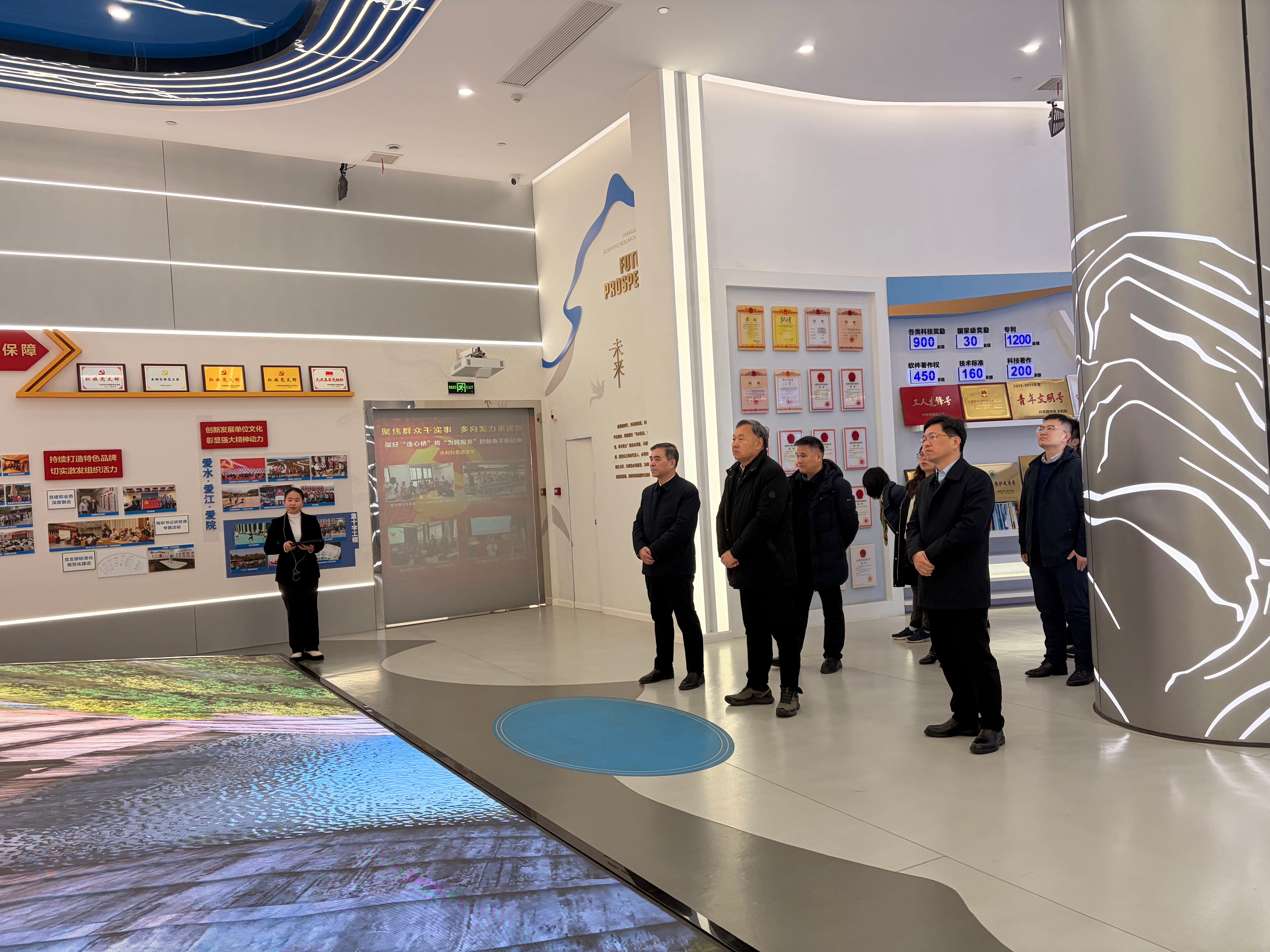 同期调研团到访长江科学院九万方基地,长江科学院院长、党委书记沙志贵带领调研团参观长江科学院展厅与工程安全所,并介绍相关情况。调研团直观了解长江科学院在水利科研、工程技术创新等领域的成果积淀,就水文科研协同、技术成果转化等议题展开深入交流,为校企科研合作与人才共育搭建了坚实桥梁。